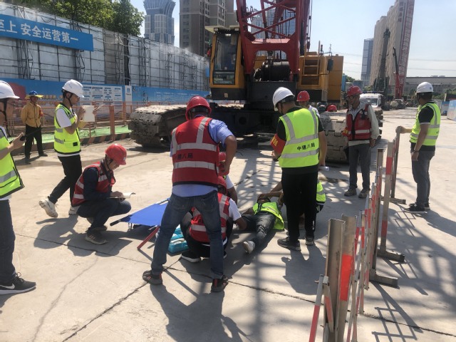 本次應(yīng)急演練活動模擬施工現(xiàn)場履帶式起重機(jī)在作業(yè)過程中由于鋼絲繩斷裂,吊物從高處掉落倒下,不幸將地面一名作業(yè)人員腳部砸傷的事故?,F(xiàn)場專職安全員發(fā)現(xiàn)后第一時(shí)間向應(yīng)急救援指揮部匯報(bào),應(yīng)急救援指揮部立即啟動應(yīng)急預(yù)案,各應(yīng)急救援小組接到救援命令后,迅速跑向事故地點(diǎn),對受傷人員開展救援工作,同時(shí)拉起警戒線,保護(hù)現(xiàn)場。救援人員按預(yù)案分工,有條不紊地實(shí)施清障、包扎、傷員擔(dān)架固定、運(yùn)送上救護(hù)車等一系列動作。本次演練活動,增強(qiáng)了員工的安全操作意識,提高了快速反應(yīng)能力、應(yīng)急救援能力以及協(xié)同作戰(zhàn)能力。