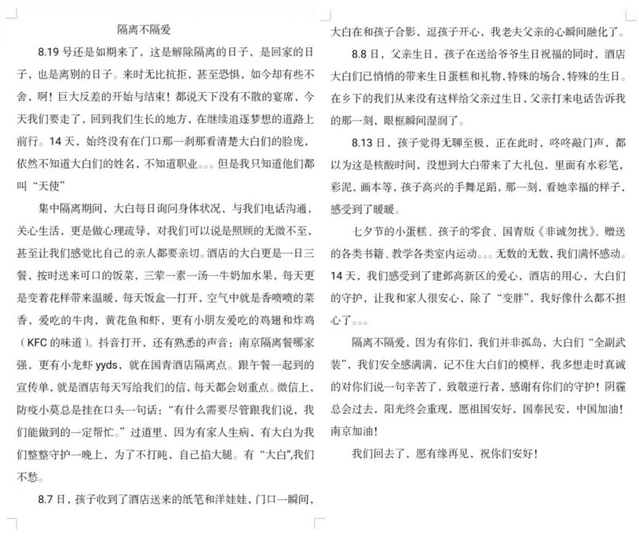 集中醫(yī)學觀察即將結(jié)束前,酒店工作人員收到了一份飽含深情的離別“禮物”。這是一封來自剛剛結(jié)束觀察生活、離開酒店順利歸家的市民朋友的感謝信,他用樸實真摯的語言回顧了與家人在酒店里生活的點點滴滴,表達了對集中觀察點指揮部、各工作組及國青酒店的感謝與祝福。