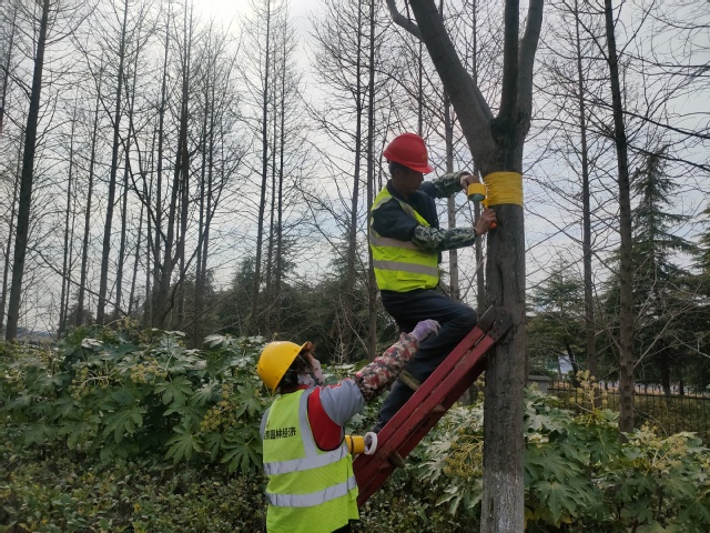 治理蚜蟲傳統(tǒng)的方式是用農(nóng)藥治理,雖然目前使用的農(nóng)藥多為低毒的菊酯類藥物,但長期使用不僅容易造成土壤板結(jié)、誤傷有益生物,還會使病蟲產(chǎn)生耐藥性,治理效果逐年降低。為此,河西集團(tuán)園林公司開動腦筋,創(chuàng)新思維,積極在南通嗇園路、建鄴區(qū)蒼山路游園開展病蟲害防治物理實驗——膠帶黏蟲。即通過在樹干分叉處將10-20公分寬的膠帶反面纏繞在樹體上,利用昆蟲的趨黃性原理和膠帶的黏性將蚜蟲黏在膠帶上,大幅度降低早春的蚜蟲蟲口密度。