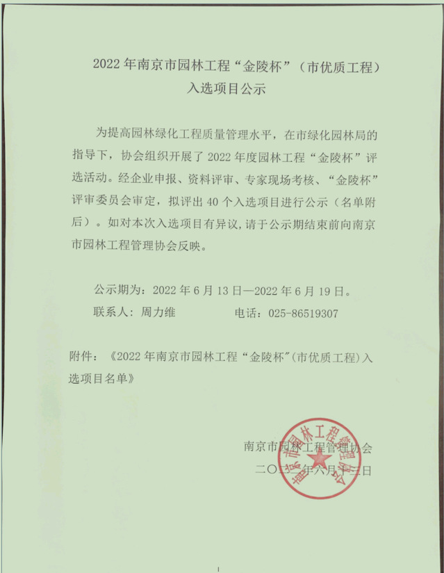 近日,由河西集團(tuán)新城公司溧水項目部代建的溧水區(qū)秦淮大道改造景觀提升工程順利通過南京市園林工程管理協(xié)會組織的”金陵“”評審,成功入選2022年南京市園林工程“金陵杯”(市優(yōu)質(zhì)工程)項目名單。